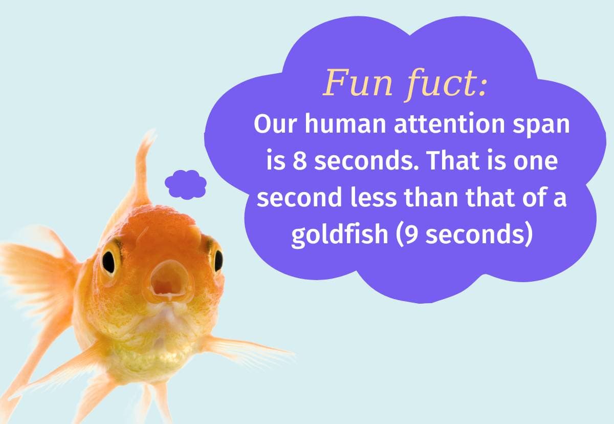 Fun fact: according to a study by Microsoft, our human attention span is 8 seconds. That is one second less than that of a goldfish (9 seconds). So, again: keep learning modules short and manageable to optimize the learning effect!